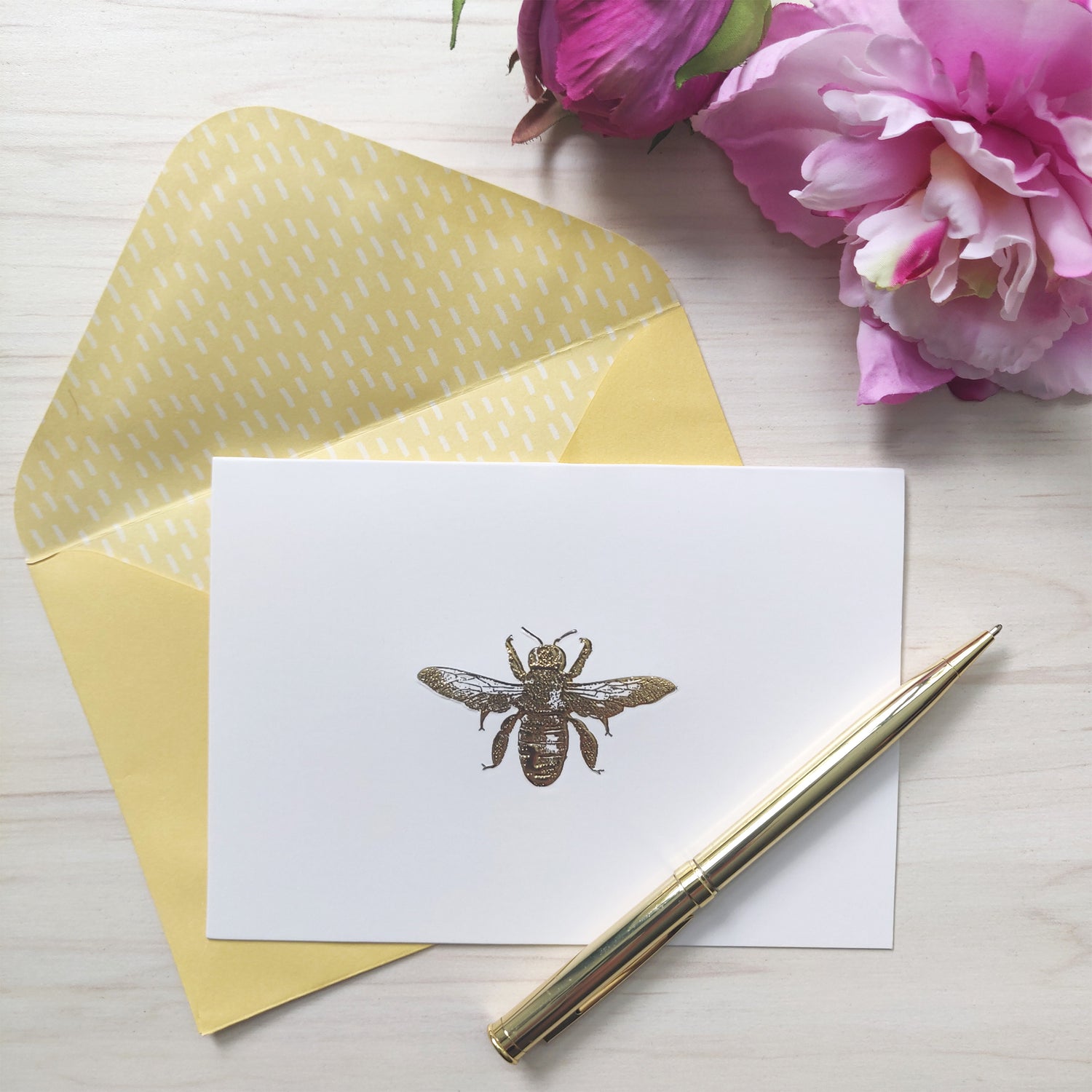 Each set includes 12 premium-quality notecards and coordinating yellow envelopes presented in a stylish gift box with an acetate cover. The cards feature a gold-embossed bee motif and are left blank inside for your own personal message.