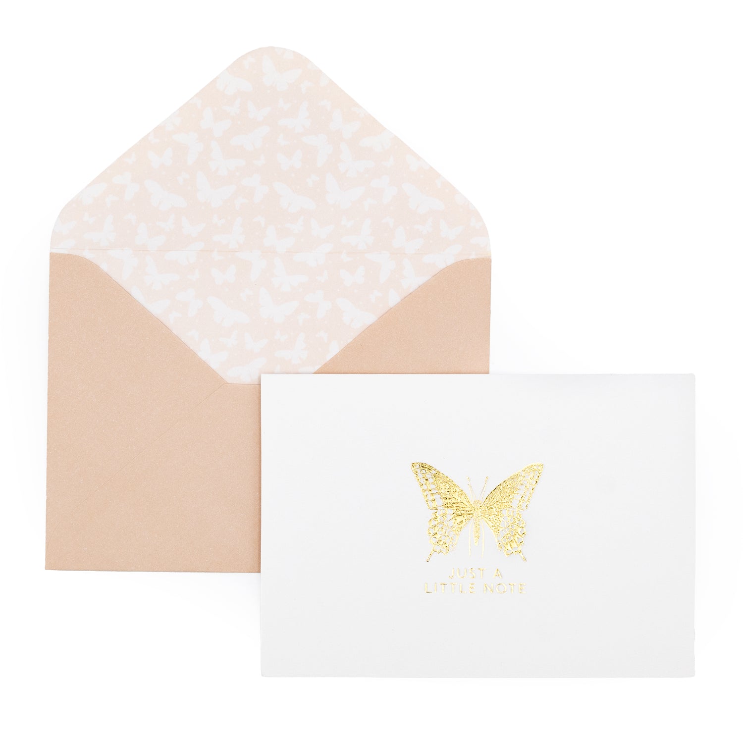 Each set includes 12 premium-quality notecards and coordinating peach envelopes presented in a stylish gift box with an acetate cover. The cards feature a gold-embossed butterfly motif with the words “Just a Little Note” and are left blank inside for your own personal message.